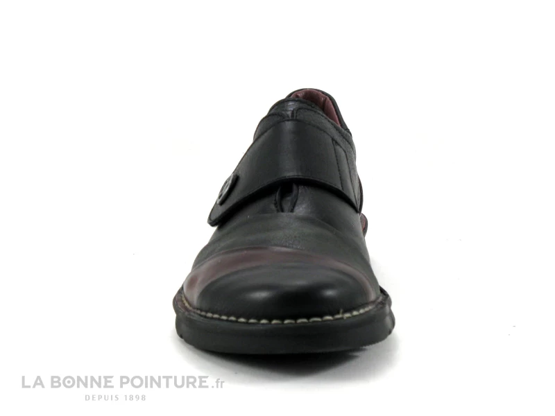 Cette chaussure basse Femme Alce mélange un cuir noir avec des empiècements bordeaux et marron foncé. Le cuir noir du derbi à scratch Femme est souple et naturellement grainé.