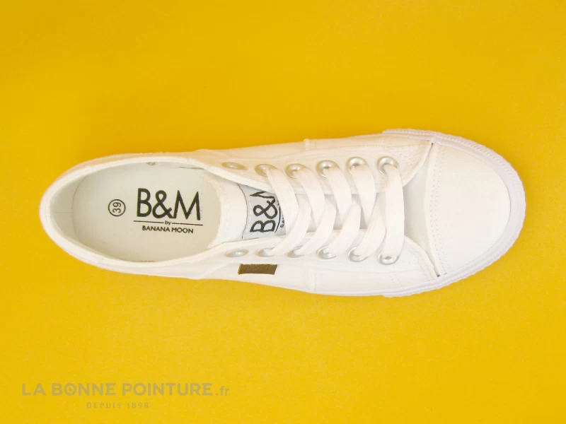Ces sneakers en toile sont blanches, avec une une petite étiquette marron sur la tige marquée B&M.