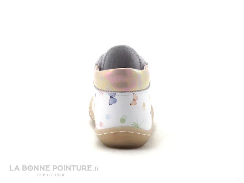 Cette ravissante chaussure montante fille fabriquée en France est en cuir souple blanc (sans chrome 6), avec pois, papillons et petites fleurs multicolores.