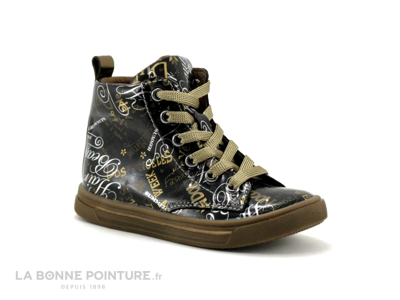Cette chaussure montante premiers pas est en cuir noir verni, ornée d’écritures, de fleurs et fioritures aux tons d’Or/bronze et d’argent.