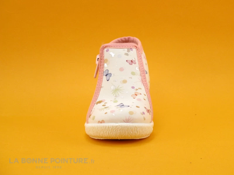 Cette pantoufle enfant fabriquée en France est en textile blanc et rose, avec plein de petits papillons qui virevoltent.