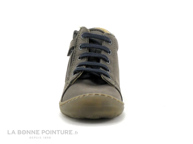 Cette chaussure montante garçon Bopy est en cuir marron taupe aspect peau de pêche, avec une partie bleu marine à l’arrière.