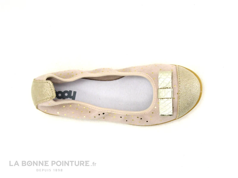 Le cuir rose de la ballerine enfant Bopy Soda est parsemé de petits pois Or, tandis que les extrémités sont beige pailleté.