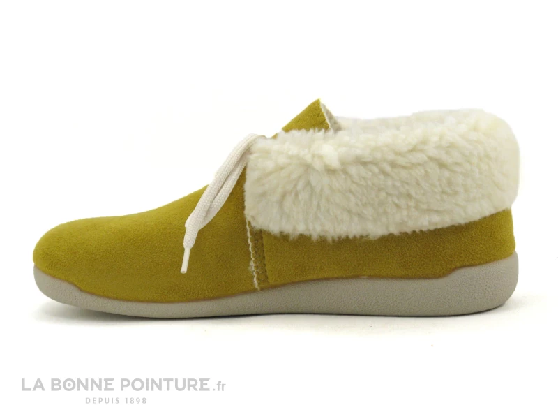 Ce chausson à lacet Femme est en velours jaune moutarde, avec un revers en fourrure beige.