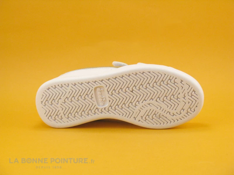 Un empiĂšcement blanc cassĂ© et irisĂ© habille l’arriĂšre des sneakers fille, avec la marque Diadora.