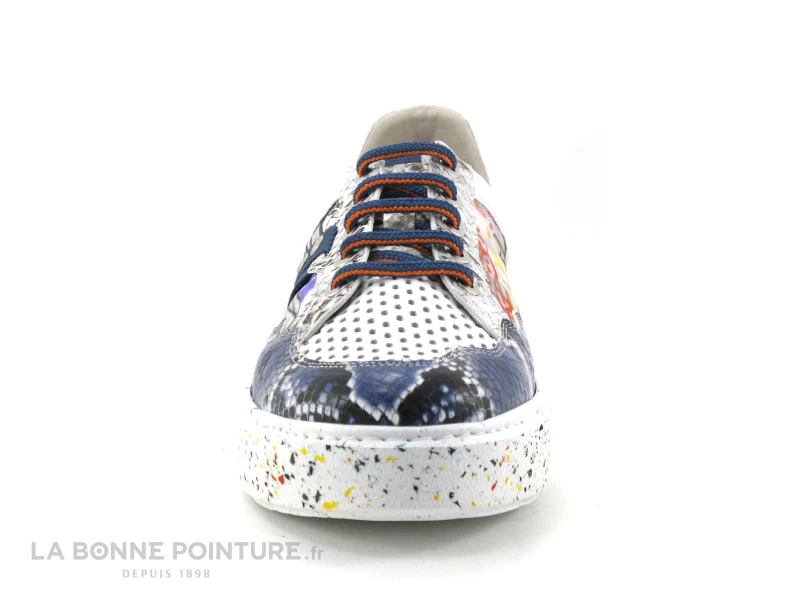 Cette basket basse femme Dorking by Fluchos Trozos combine des parties perforées blanches, imprimées multicolores et aspect python.