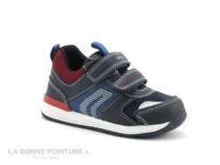 Cette chaussure bébé souple Geox Rishon associe textile et matières résistantes bleu marine, avec des parties rouges et bleu jeans.