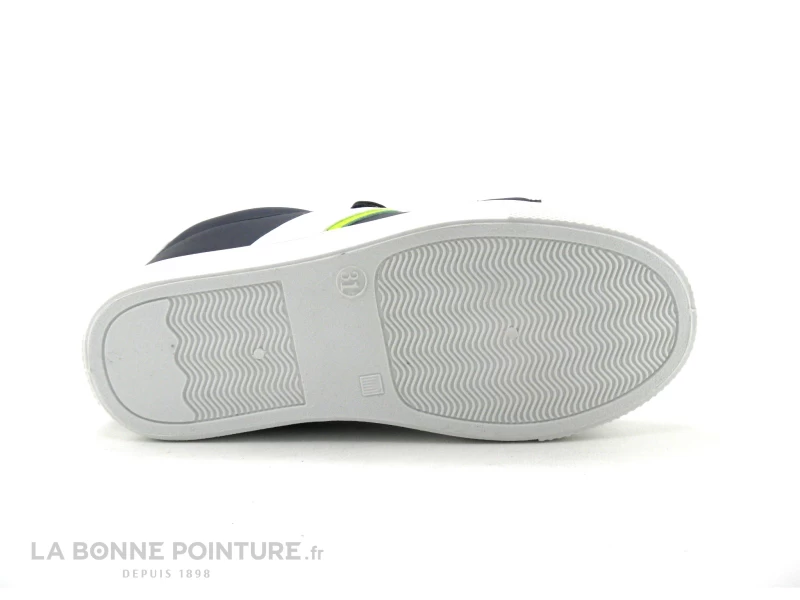Cette basket enfant petit prix est bleu foncé, avec un peu de blanc et un trait jaune fluo sur le côté.