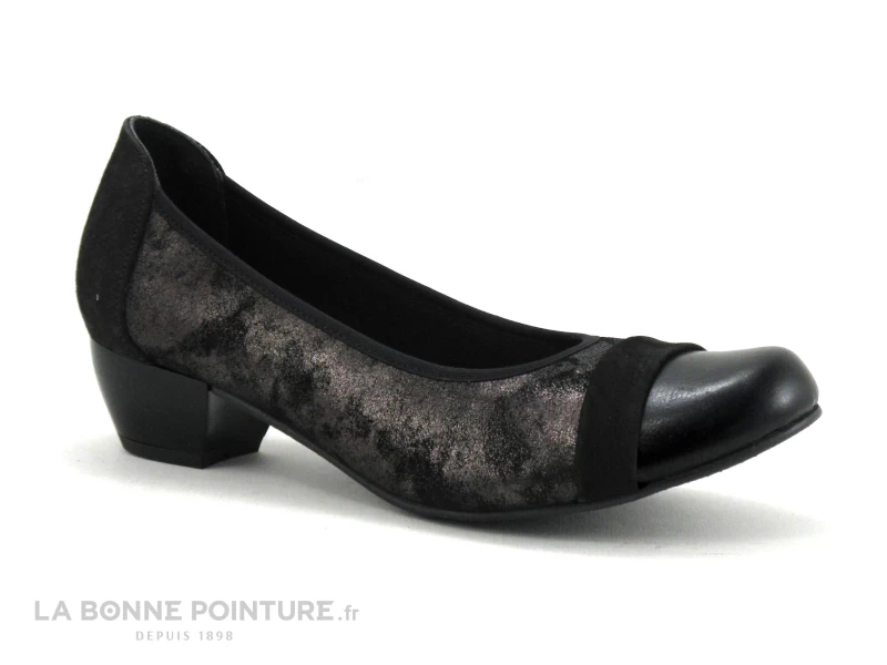 Cet escarpin confort Inéa est noir et bronze métallisé, avec un bandeau velouté sur l’avant.