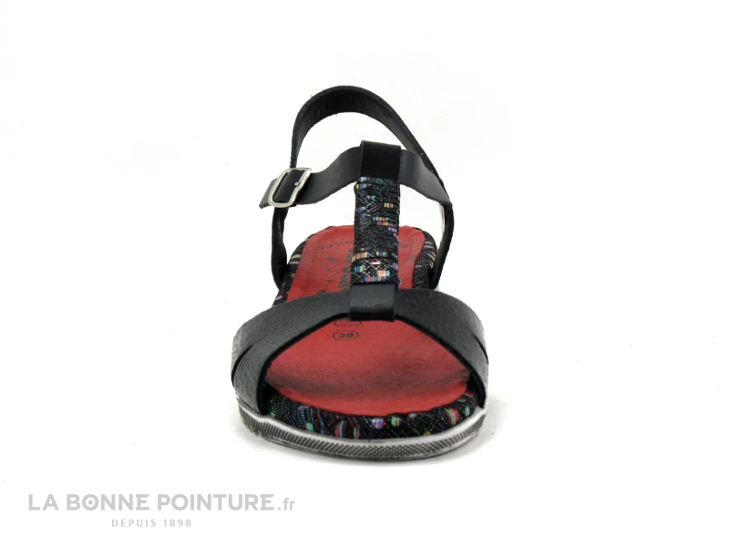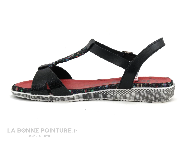 Ce nu-pieds Jordana fabriqué en Espagne est en cuir noir verni effet reptile, avec de fins liserés multicolores sur la bride salomé et sur le pourtour.