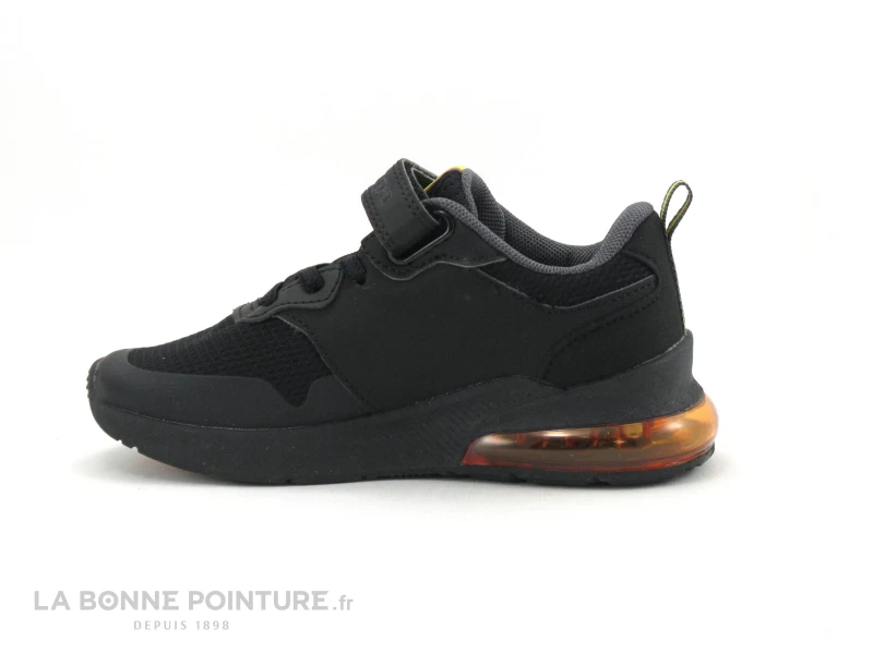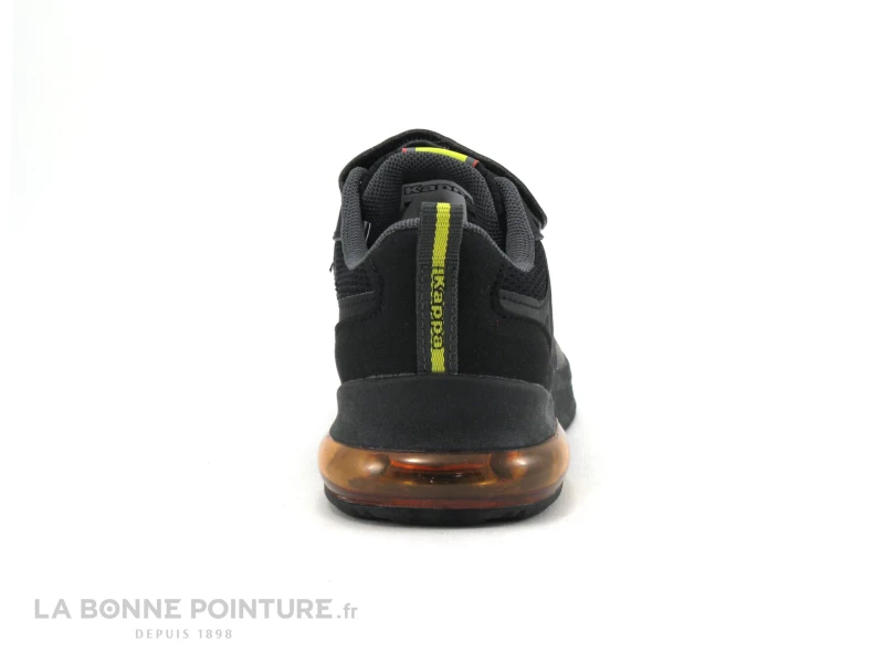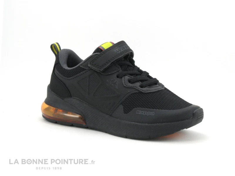 Ces baskets enfant Kappa Kid sont en en textile et matiĂšres synthĂ©tiques noirs, avec un peu de jaune et d’orange.
