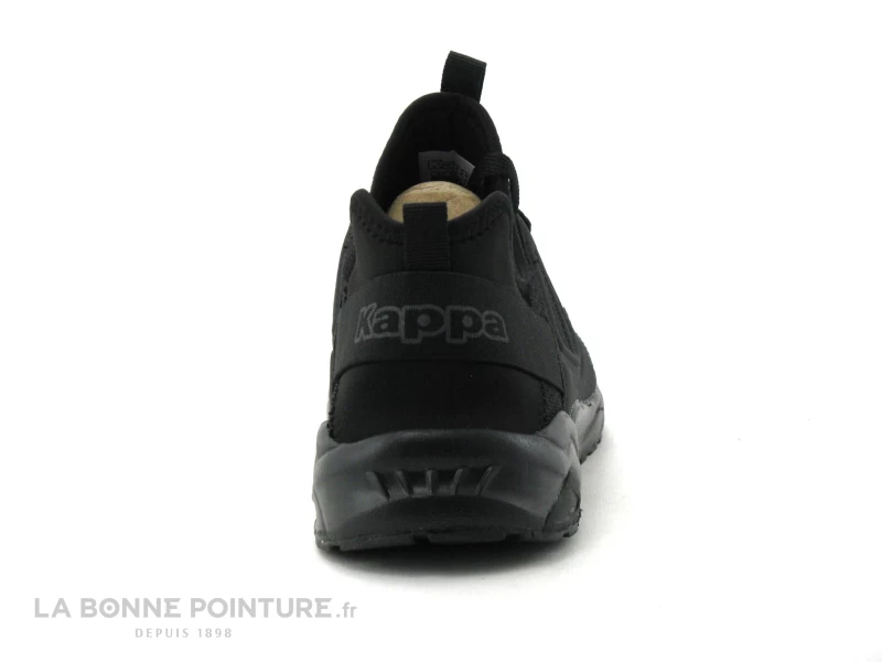 Cette basket unisex Kappa est en textile et matière synthétiques résistantes noires, avec un élastique à l’arrière marqué Kappa en gris.