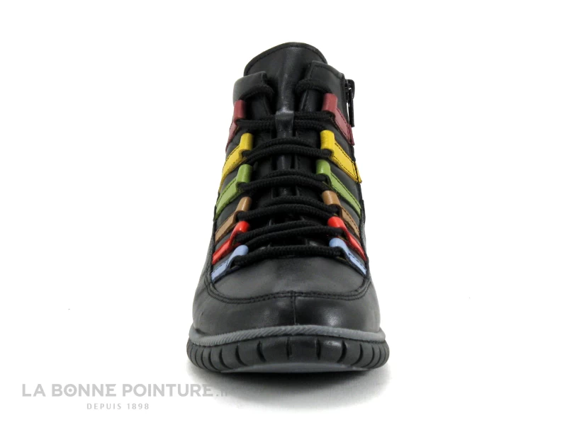 Cette chaussure montante Femme Karyoka Quinto est en cuir souple noir, avec de fines bandes et oeillets multicolores qui caractérisent la bottine.