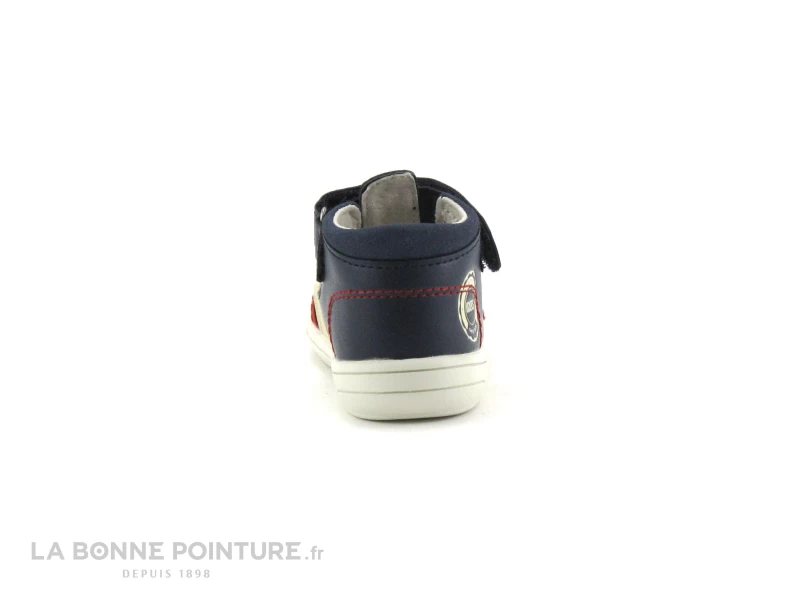 Cette sandale bébé à bout fermé est bleu marine avec deux bandes parallèles rouge et beige sur le devant.