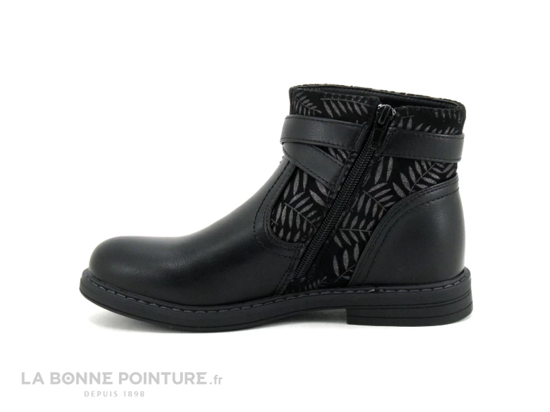 Cette bottine enfant Lilybellule Gaillac est noire, avec une partie parsemée de fougères grises et pailletées.
