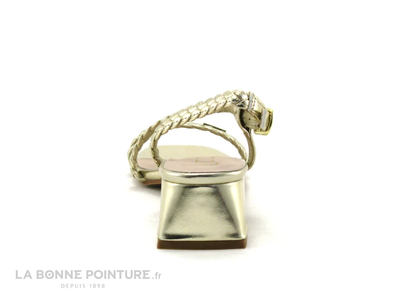 Une lanière étroite tressée or enveloppe l’avant du pied, tandis qu’une seconde traverse le coup de pied en enrobant le talon.