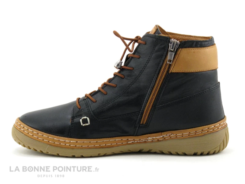 Cette chaussure montante Femme Madory Numa est en cuir lisse noir, avec un peu de cuir marron camel.
