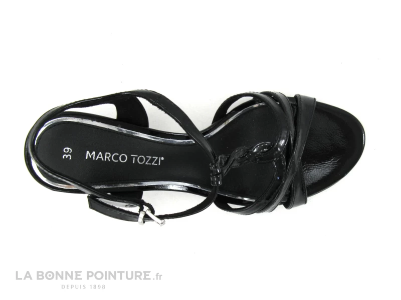 Cette sandale noir verni à talon haut Marco Tozzi 2-28339-28 possède une bride salomé torsadée, qui habille joliment le dessus du pied.