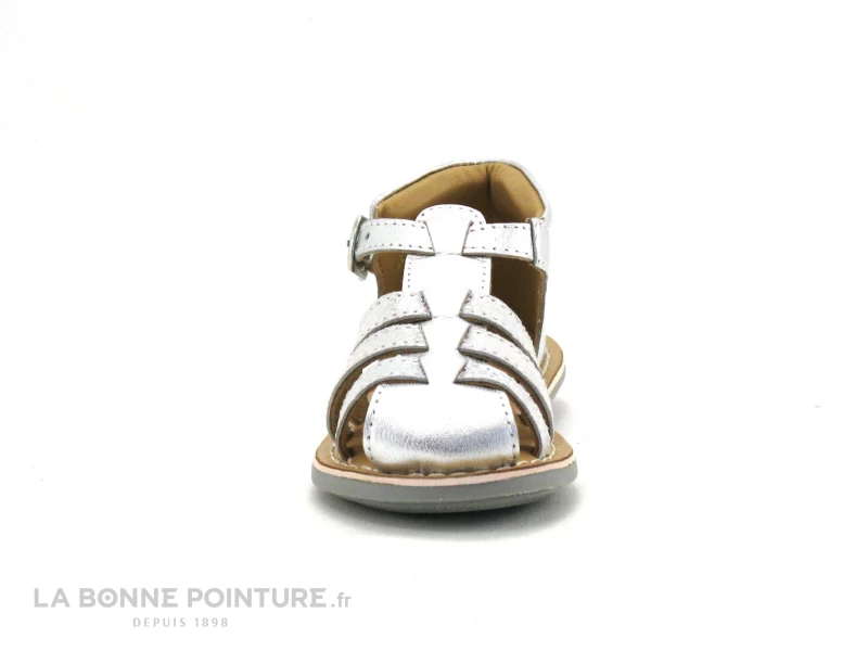 Ce nu-pied enfant Minibel est en cuir argenté, avec des lanières fantaisie en cuir velours sur le devant.