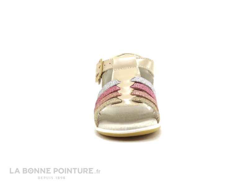 Ce nu-pieds fille est beige verni, avec des lanières pailletées roses, or et argent.