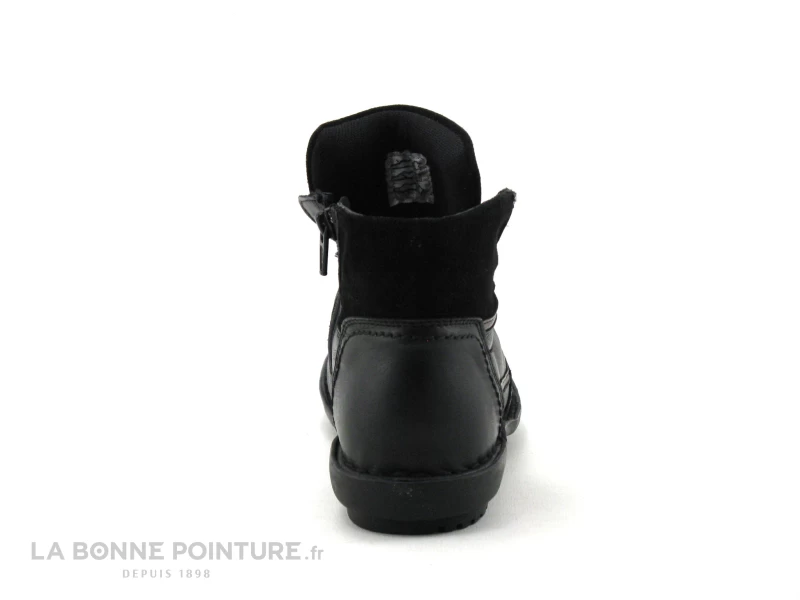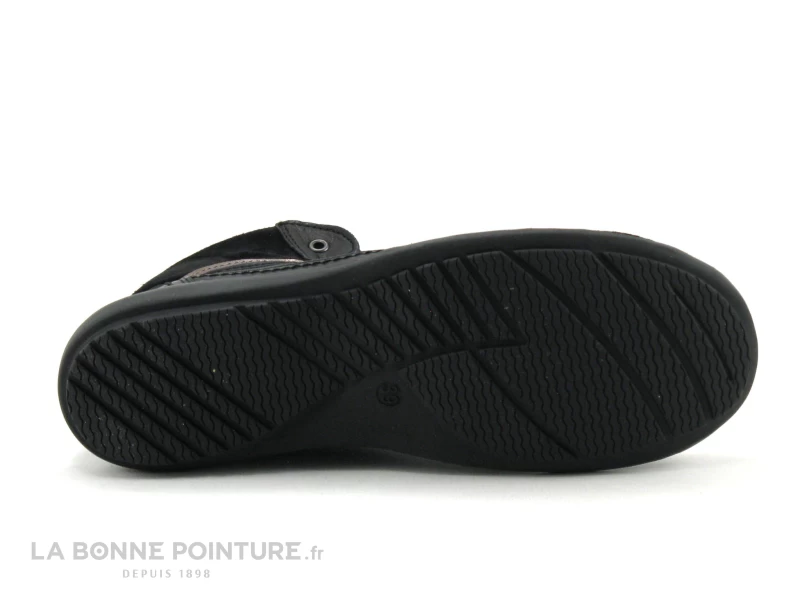 Cette chaussure Femme avec semelle souple mélange un cuir lisse et un cuir velouté noir.