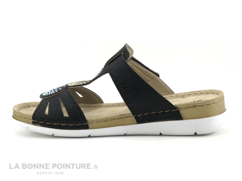 Cette mule pas chère Femme Moran’s est en simili cuir noir aux légers reflets bleu marine.