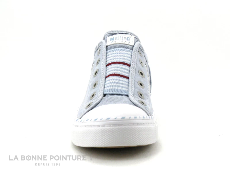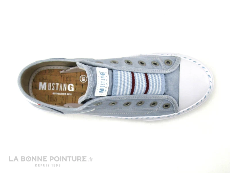 Cette belle basket basse Femme Mustang est en toile bleu ciel, avec un large élastique rayé sur le dessus.
