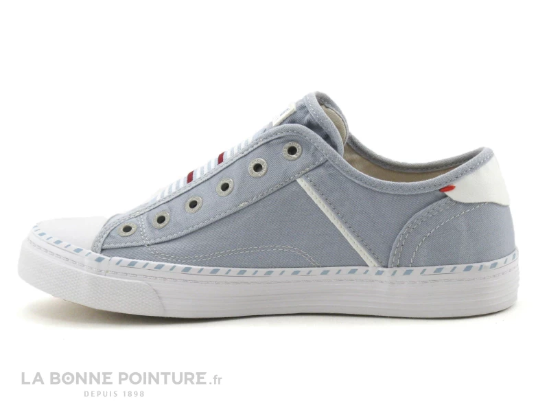 La languette de la chaussure toile Femme Mustang 1376 est traversée par un élastique invisible, qui permet d’enfiler rapidement la basket. Les oeillets sont juste décoratifs.