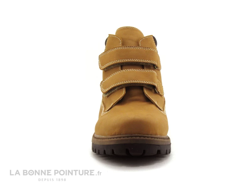 Cette chaussure montante enfant est en simili cuir camel / jaune gold, avec l’encolure noire et matelassée.