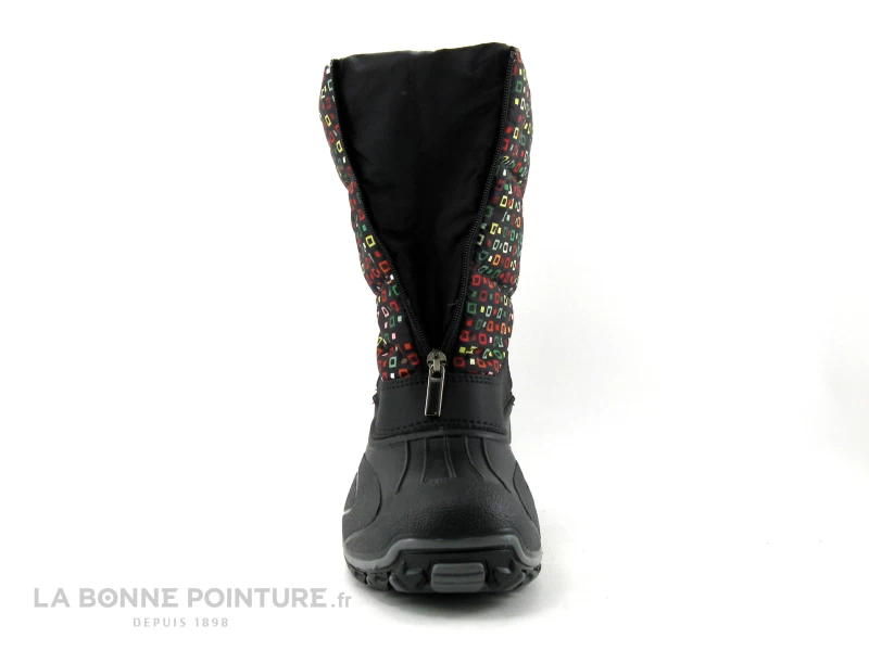 Le haut des boots neige est en textile nylon imprimé de petits carrés multicolores sur fond noir.