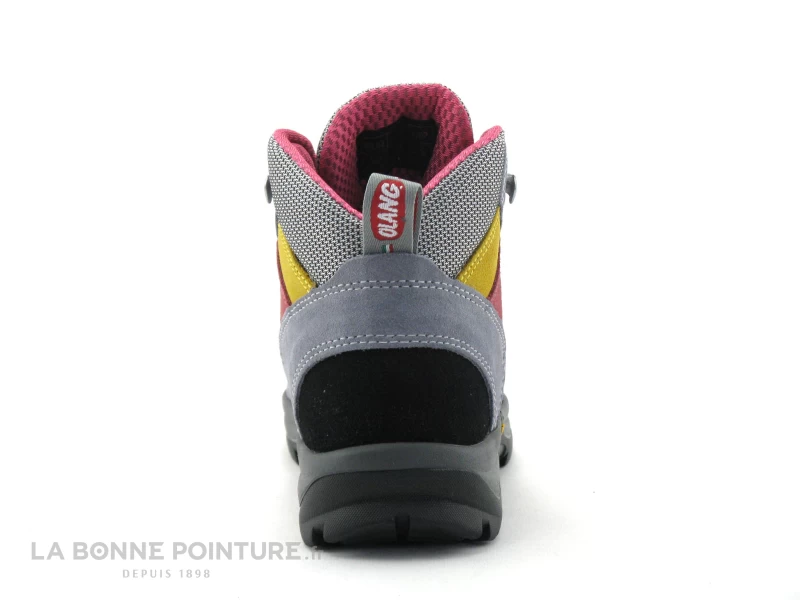 Cette chaussure montante de marche Femme Olang Gottardo mélange cuir velours et textile grisé, relevé par des touches de rose, de jaune et de noir.