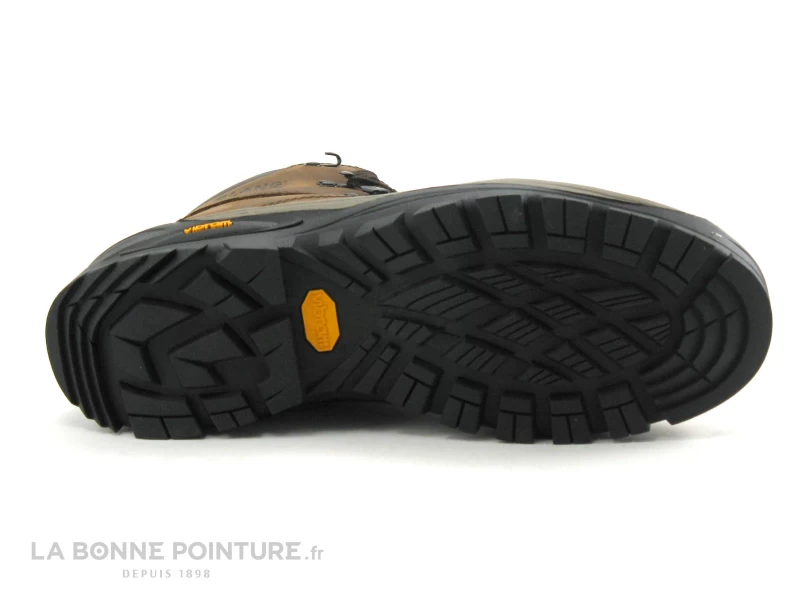 Cette chaussure de marche Olang Homme est montée sur une semelle Vibram avec crampons, épaisse d’environ 4 cm au talon.