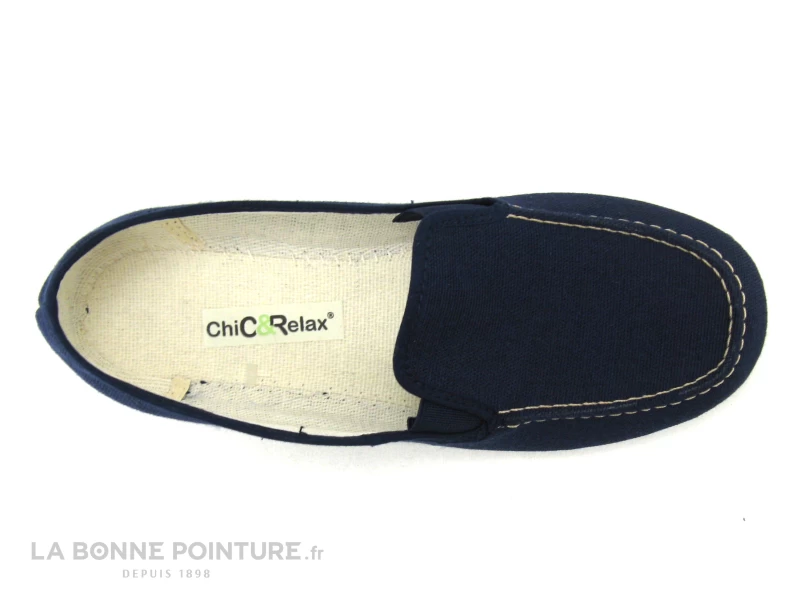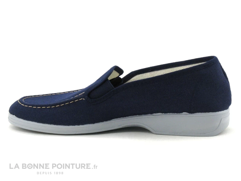 Cette chaussure Homme pas chères et facile à enfiler Chic et Relax est en toile bleu marine, avec 2 élastiques d’aisance au niveau du coup de pied.