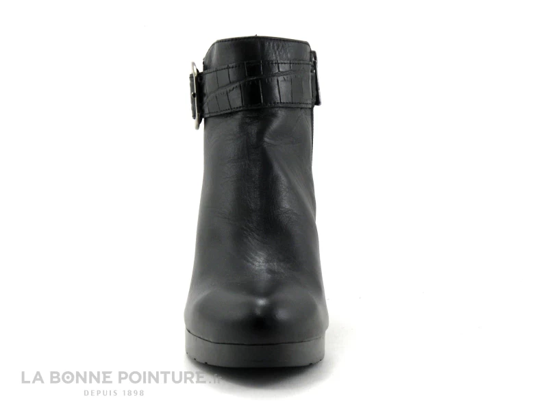 Cette bottine mode Femme est en cuir lisse noir, avec une partie aspect croco à l’arrière.