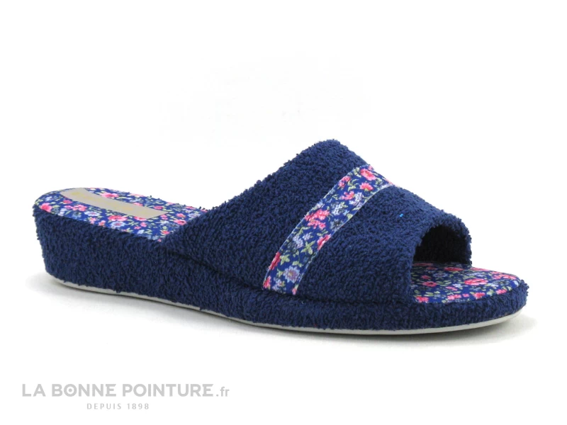 Cette mule compensée est en tissu éponge bleu marine, avec la semelle en tissu fleuri aux tons de rose et de vert sur fond bleu.