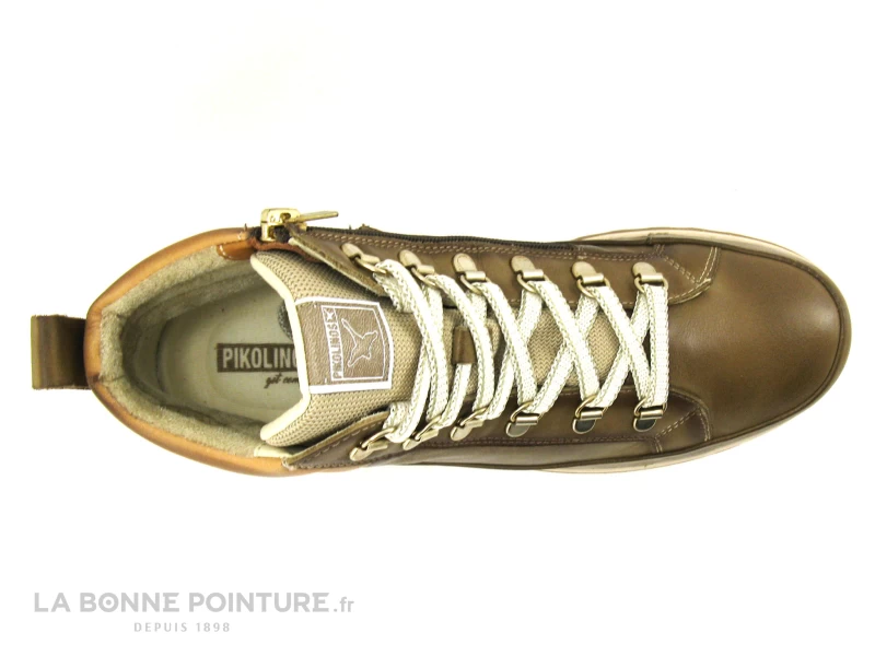 La languette en tissu beige est matelassée pour votre confort, tout comme l’encolure du bottillon Femme Pikolinos.