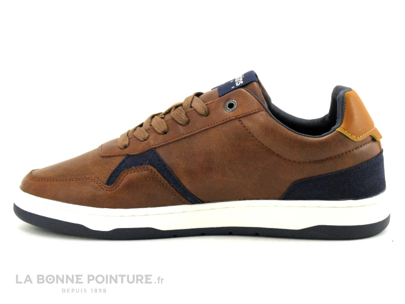 Ces belles sneakers Homme Redskins Diverti sont en simili cuir marron cognac nuancé et bleu marine velouté.