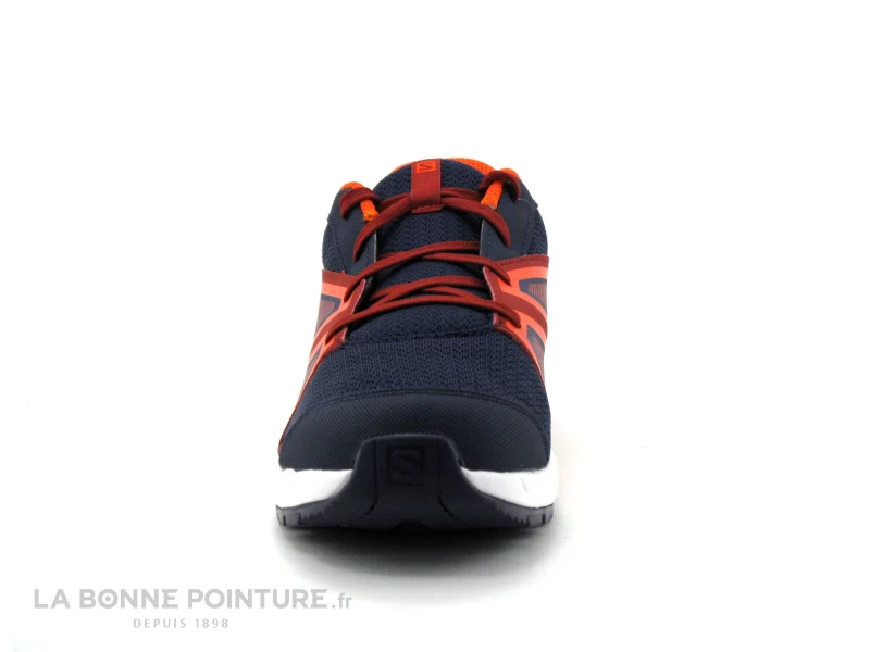 Cette chaussure de marche Salomon est en textile respirant et matières synthétiques résistantes bleu marine, avec les côtés rouge/bordeaux et orange.