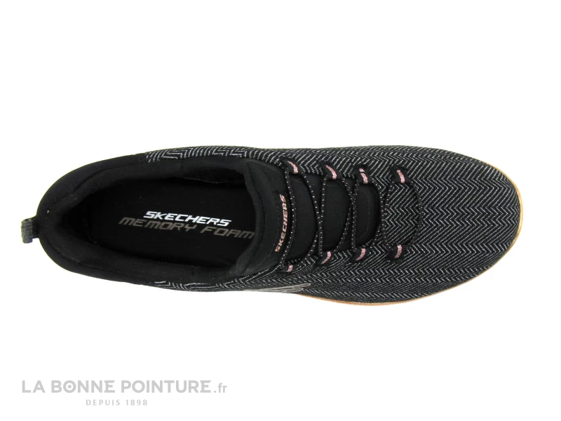Pas de fermeture, la basket Femme noire Skechers Summits s’enfile en un clin d’oeil ! Elle est ornée d’un lacet élastique noir et rose gold sur le dessus.