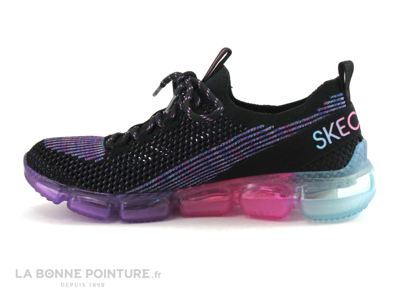 Cette chaussure de sport Skech-Air by Skechers est en maille respirante noire, rose, violette et bleue, avec la marque Skechers sur l’arrière.