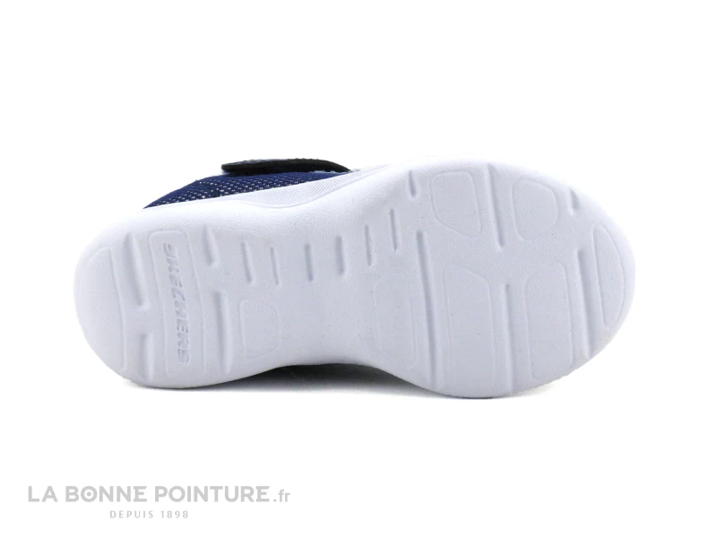 Le lacet élastique bleu marine permet d’enfiler rapidement la chaussure bébé Skechers Easy Peasy. Fermeture facile des sneakers fille Skechers avec la bride à velcro.