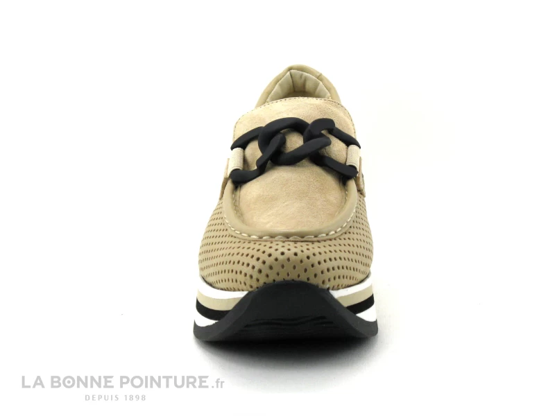 Ce mocassin Femme Softwaves Cassie associe cuir lisse beige et daim du même ton, avec un liseré noir à l’arrière.