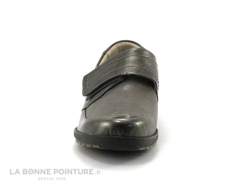 Cette chaussure classique Femme mélange mélange un cuir velours gris et un cuir argent métal aspect verni.