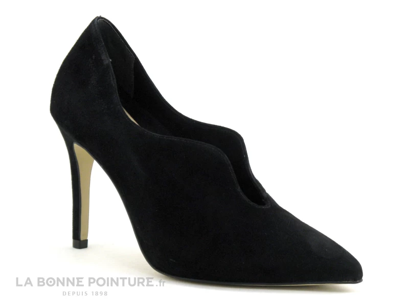 Cette belle chaussure à talon aiguille est en cuir velouté noir, avec la tige en forme de vague.