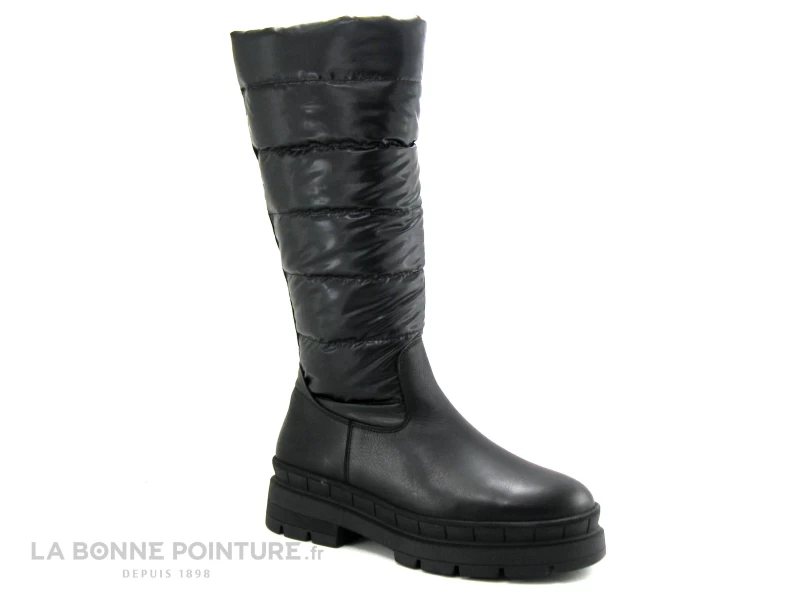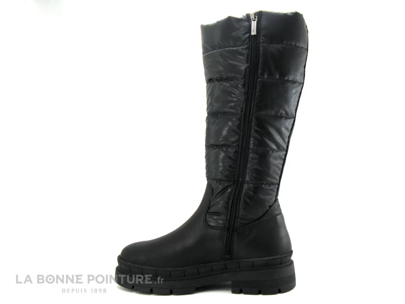 La base de cette botte plateforme Tamaris 26629 est en cuir lisse noir, avec la partie haute en textile matelassé noir.