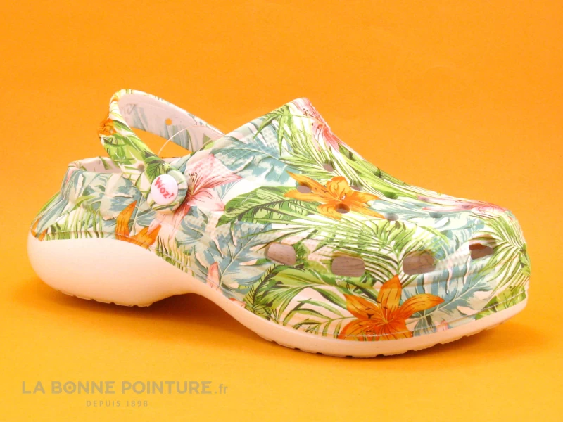 Ce ravissant sabot léger Femme Woz Delfin est en eva imprimé floral, aux tons de vert, de rose et d’orange sur fond blanc.
