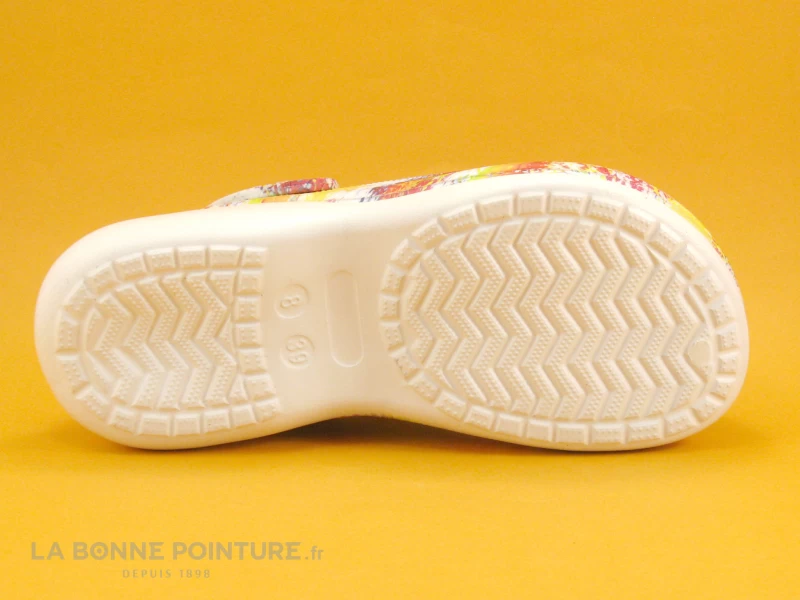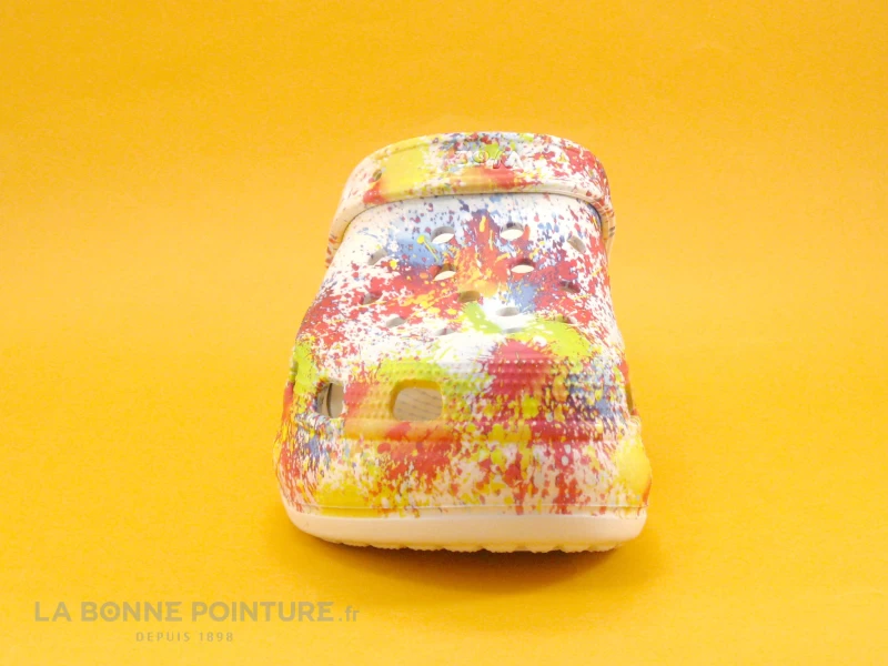 Ce sabot léger Femme Woz Delfin est en eva multicolore aspect taches de peinture (tie dye) sur un fond blanc.